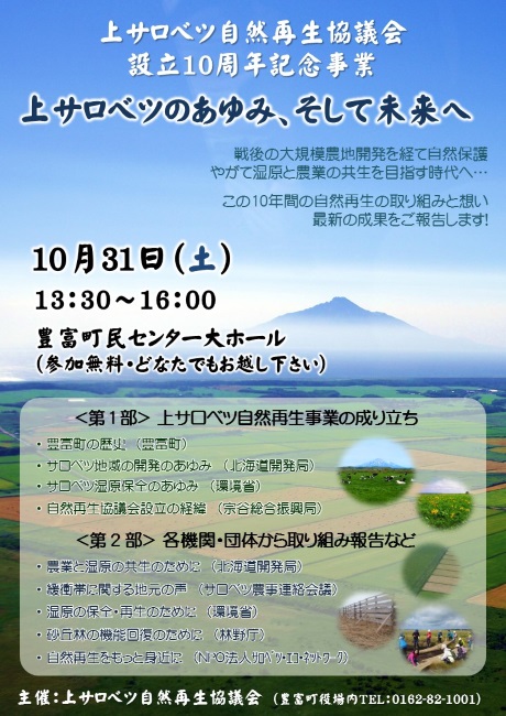 平成27年10月31日(土)、上サロベツ自然再生協議会主催で「上サロベツのあゆみ、そして未来へ」と題し、設立10周年記念報告会を開催致します。