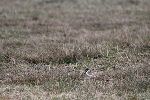 オオジュリンが地を這い、湿原を歩いています。黒色の頭が目印です。